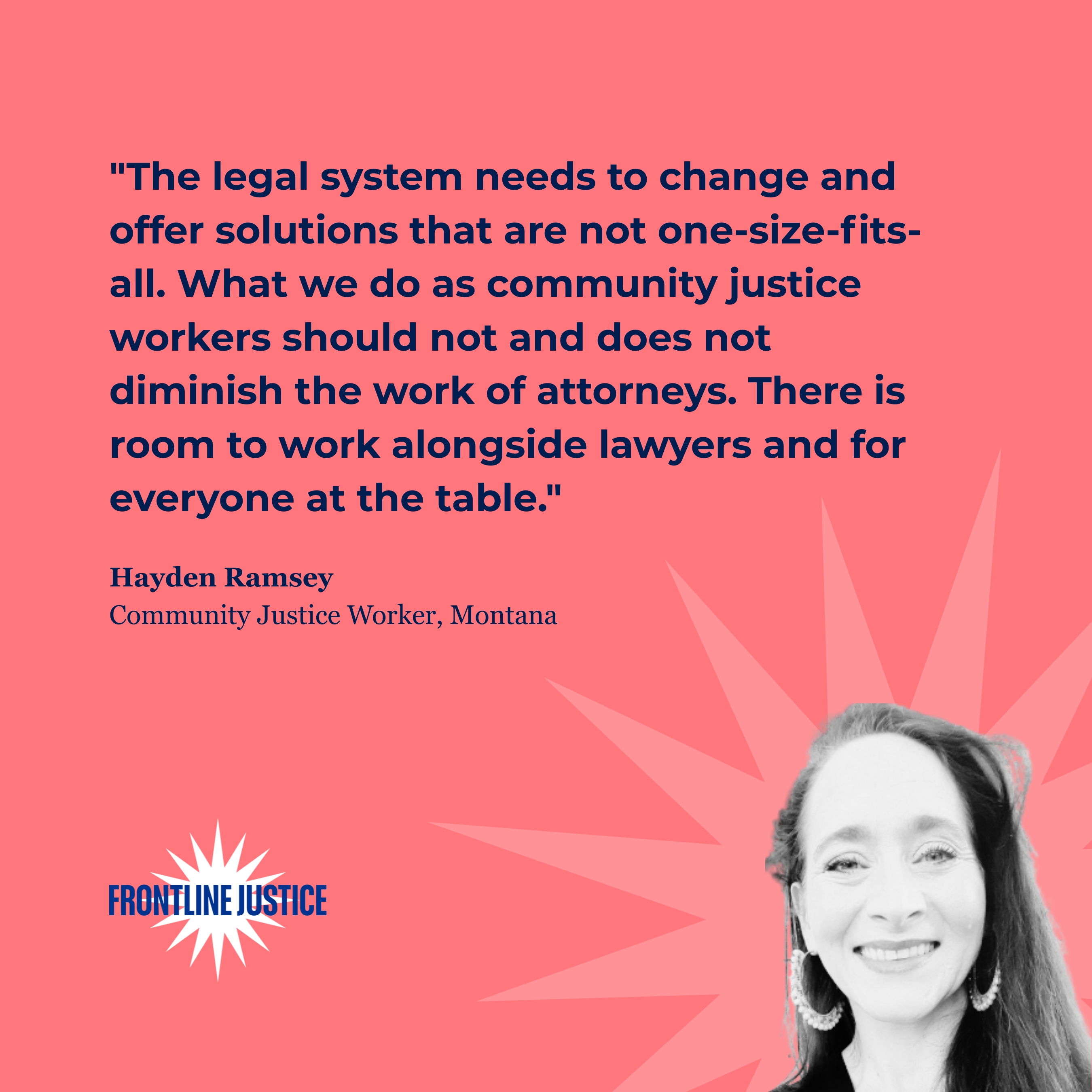 | | Community Justice Worker Spotlight: Hayden Ramsey | | Hayden was never one to let the grass grow under her feet. A culinary school grad, world traveler, and former restaurant owner, she appreciates and enjoys life. But change is inevitable, and when the world was experiencing the recession, she felt the impact—hard. Struggling to afford food and keep the power on, she felt powerless. The challenges persisted as she navigated complex systems and applications for support, only to be denied SNAP benefits.